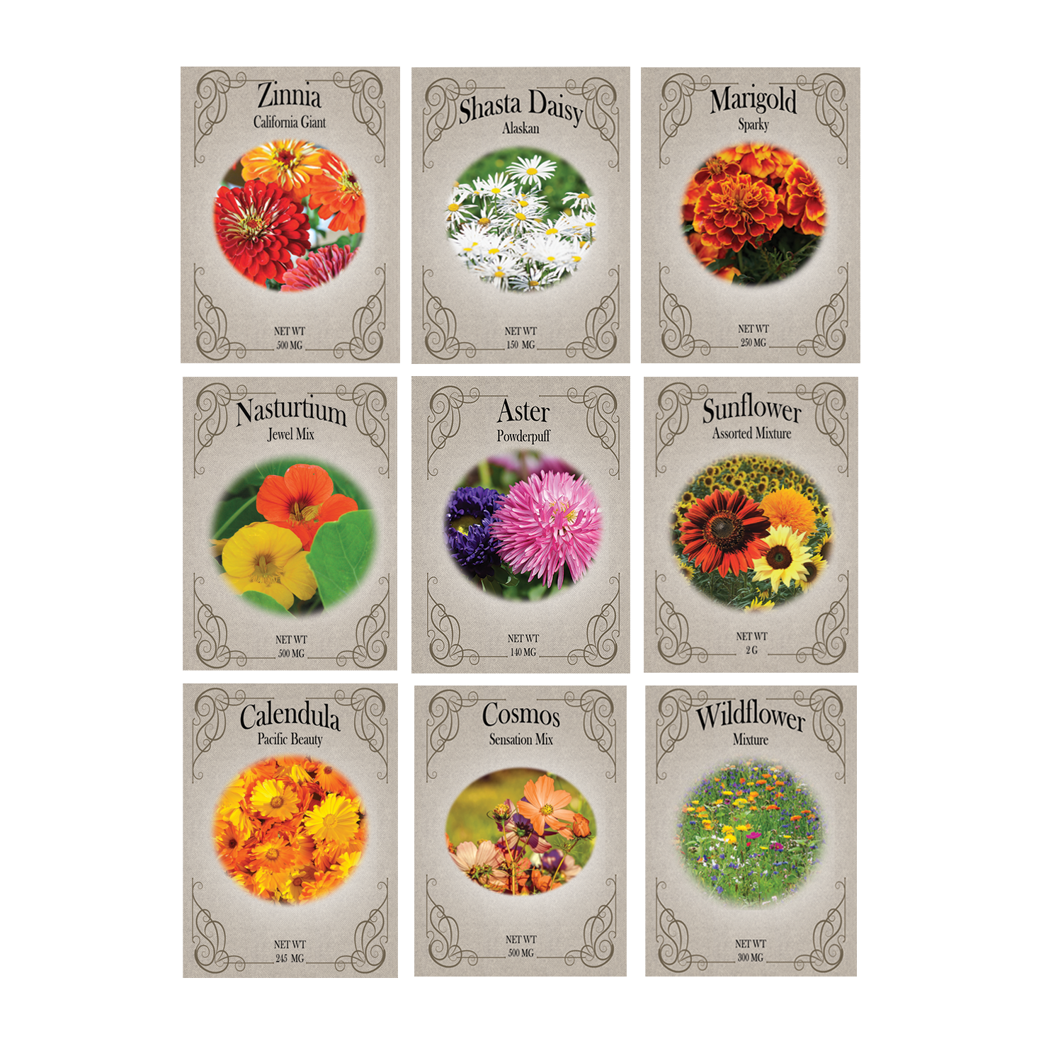 - Grow Your Own Garden! Set Features: Calendula, Nasturtium, Marigold Sparky, Cosmos, Wildflowers, Zinnia California, Shasta Daisy, Assorted Mix Sunflowers, and Aster Powderpuff Seeds!