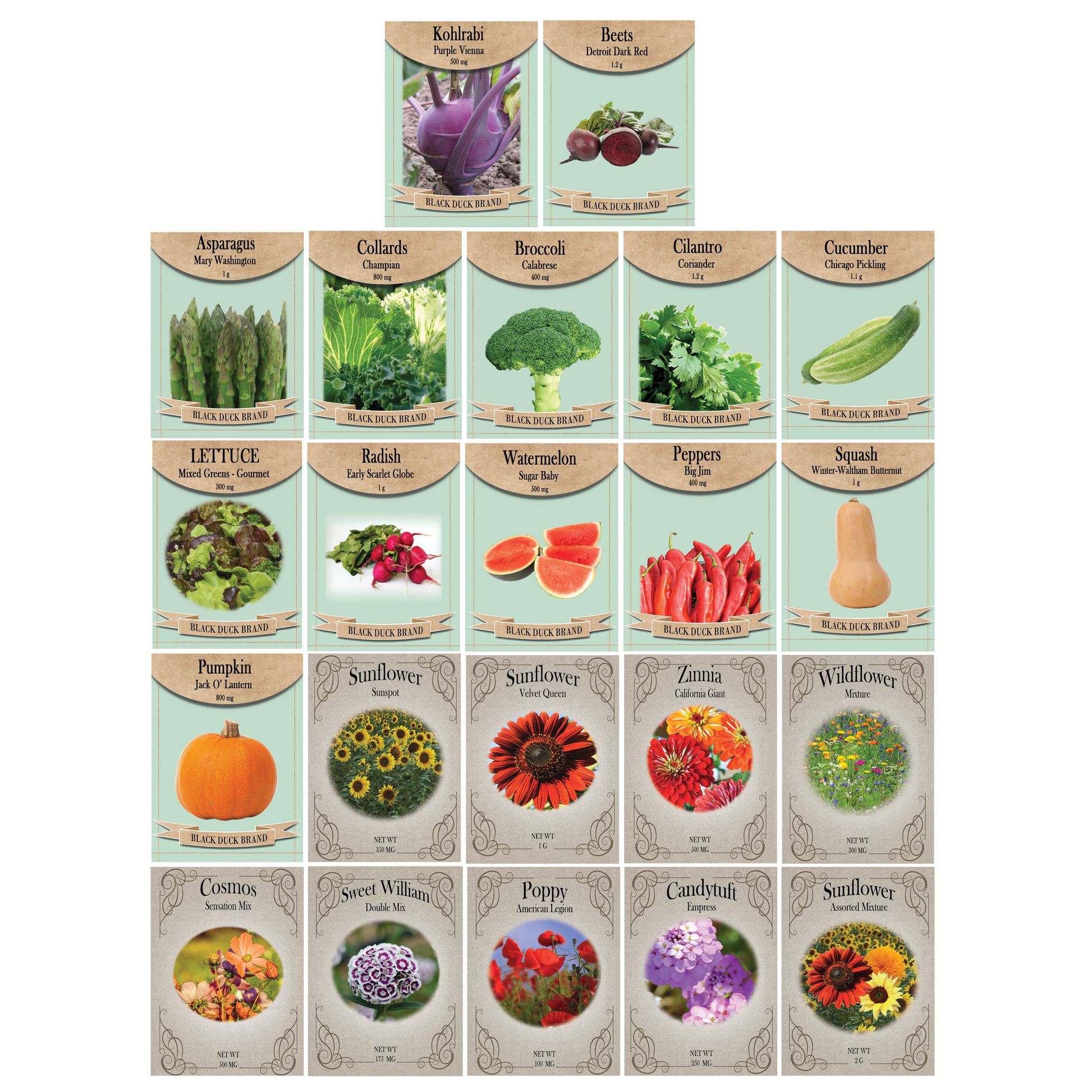Flower & Vegetable Seed Set - 22 Varieties of Non-GMO Heirloom Premium Seeds for Planting - Asparagus, Beet, Broccoli, Wildflower, and More