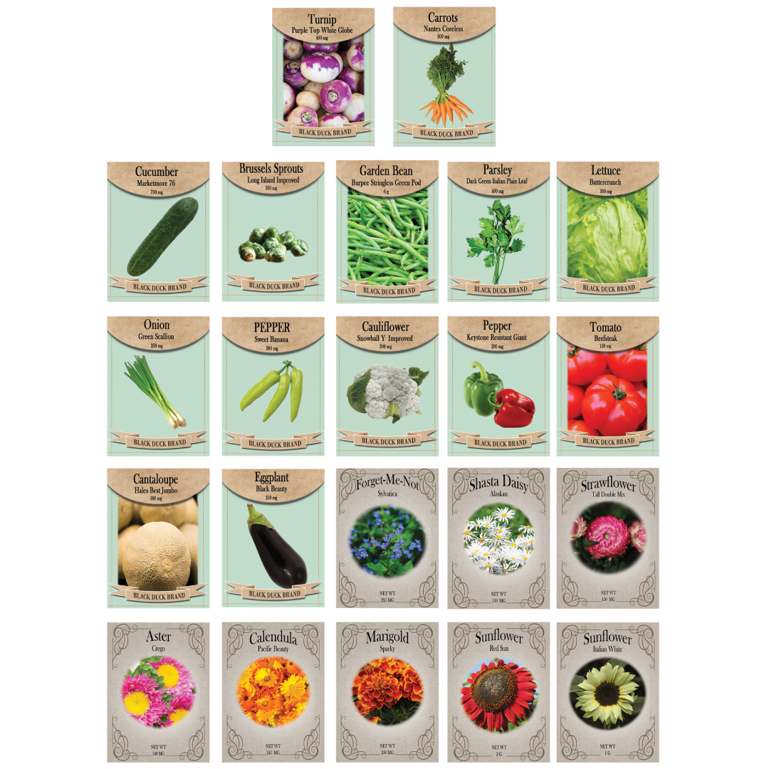 Flower & Vegetable Seed Set - 22 Varieties of Non-GMO Heirloom Premium Seeds for Planting - Brussel Sprouts, Cantaloupe, Peppers, Marigolds, and More