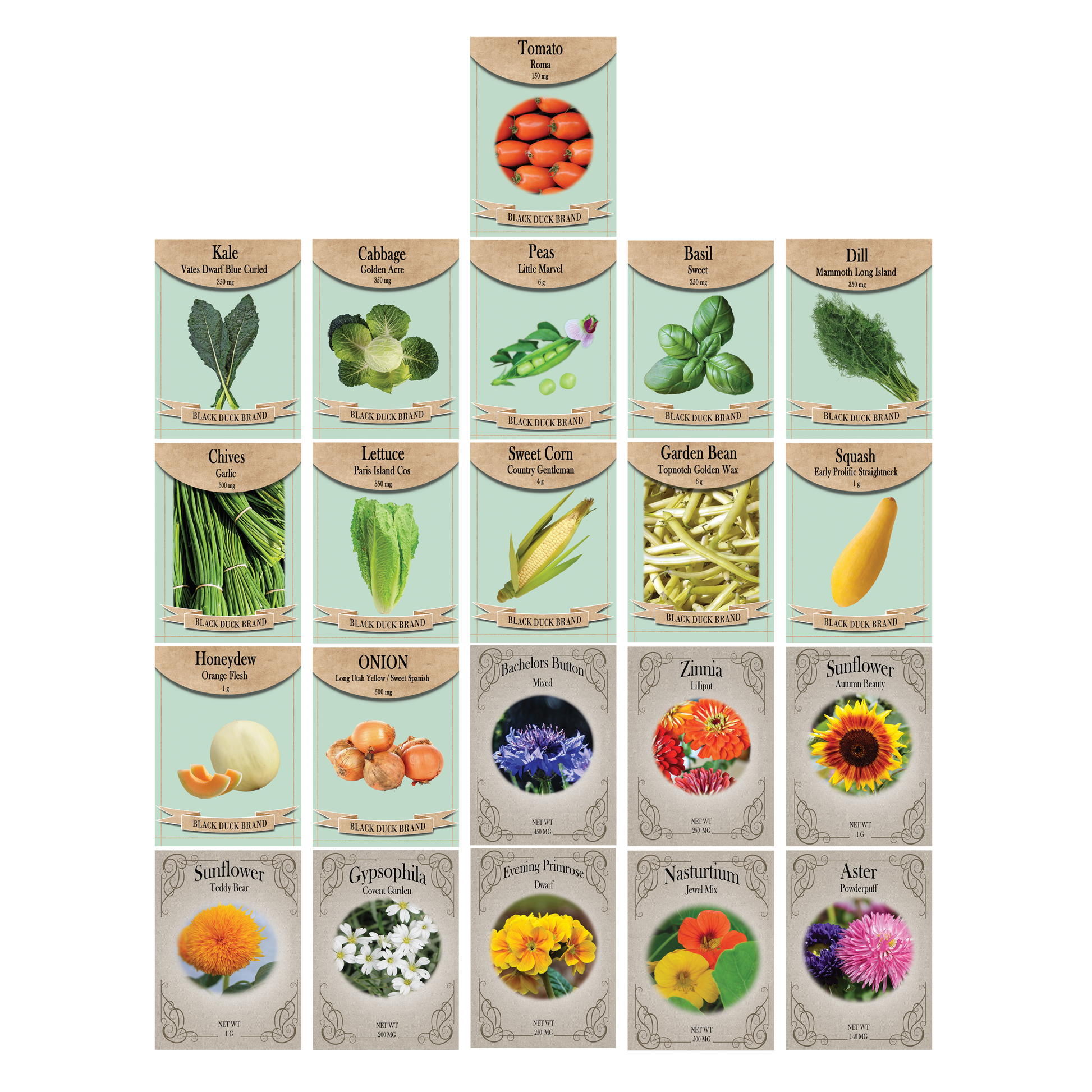 Vegetable, Flower & Herb Seed Set - 21 Varieties of Non-GMO Heirloom Premium Seeds for Planting - Cabbage, Roma Tomato, Peas, Sunflowers, and More